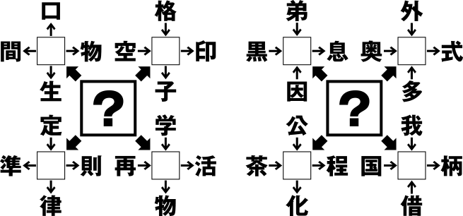 形は複雑になったがやることは謎Cと変わりない。まず左ブロックの□には左上から人、調、規、生の4文字が入る。そして答えは“新”(新人・新潮・新規・新生)となる。同様に右ブロックは左上から子、様、道、家の4文字が入り、答えは“王”(王子・王様・王道・王家)となる。