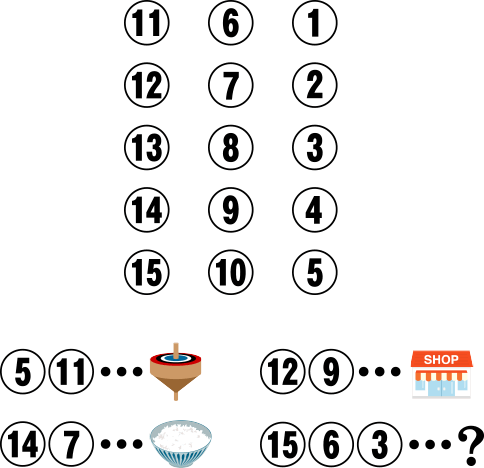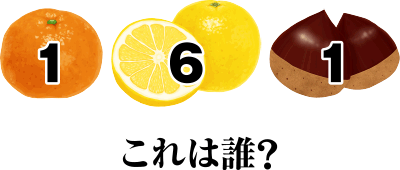 画像はみかん・グレープフルーツ・くり。数字の順番の文字をつないでいくと「みるく」となる。