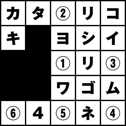 クロスワードではなく番号の順番が重要。@ABCDの枠を順番にたどっていこう。文字をつなげると「ヨシムネ4(吉宗4)」となる。