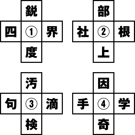漢字の熟語クイズ。それぞれの答えをつなげると「角屋点数」となる。