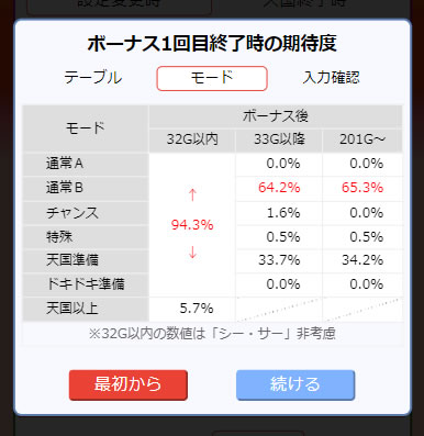 この狙い方自体はすでに浸透しているので目新しくはないのですが、では一体何が新しいかと言えば、「モードテーブル推測ツールを使うことで、現在のモードやテーブルが数値化され、一発で見えること」。これまで何となく、「奇数テーブルっぽい。通常B以上にはいそう」と思っていたものが、「今はテーブル13の通常Bに42%で期待できる」と分かるようになるんですよ。これによって自信を持って打ち続けられますし、ちょっとしたスパイスにもなって面白いんですよね。