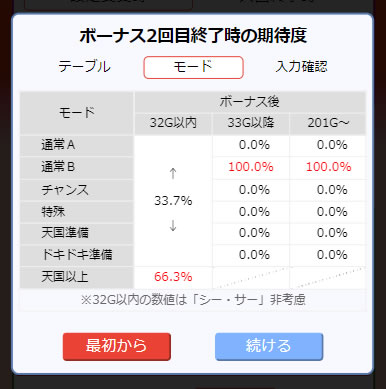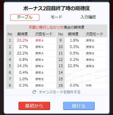 こちらも1回目のボーナス後に最も期待できるのは、テーブル13の通常B(期待度42%)という結果に。次回のモードも通常A以外が76.7%の期待度なので当然続行ですよね。さあ、今回も天国まで追いかけますよ! なんて思っていたのですが、2回目のボーナスを引くと、その気持ちは180度変わりました。まずはこちらをご覧ください。2回目のボーナス後のテーブルモード期待度です。