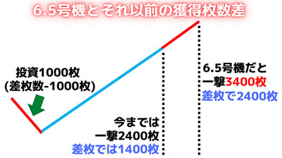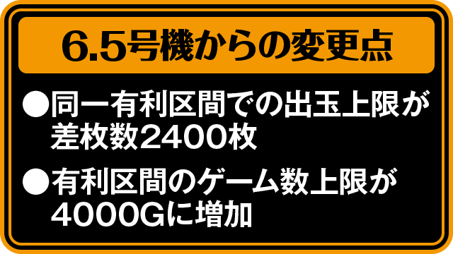 6.4号機以前の出玉上限は「2400枚」だったが、これが6.5号機では「差枚数2400枚」となった(どちらも同一有利区間が条件)。