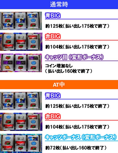 これを見てわかるように、通常時の変形ボーナスが「キャッツ目」であり、AT中の変形ボーナスが「キャッツボーナス」となっている。