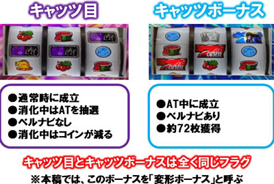この変形ボーナスは通常時に成立するとキャッツ目となりAT抽選が行われる。しかし、あくまで通常時の一部なのでコインは減少。対して、変形ボーナスがAT中に成立するとキャッツボーナスとなり、消化中はベルナビが発生。約72枚獲得できるボーナスとなる。