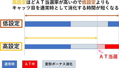 そして、この「変形ボーナスを消化する時間」こそが、通常時のボーナス確率に設定差が生まれる所以。本機は高設定ほどキャッツ目からATに入りやすく、そこに設定差が設けられているのだが、簡単に説明すると以下のような図式が成り立つ。