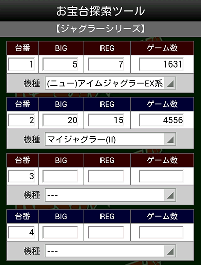 空き台の「ゲーム数」「BIG回数」「REG回数」「機種(選択)」を一度に入力すれば、以下の2パターンでランキングを作成し表示します。