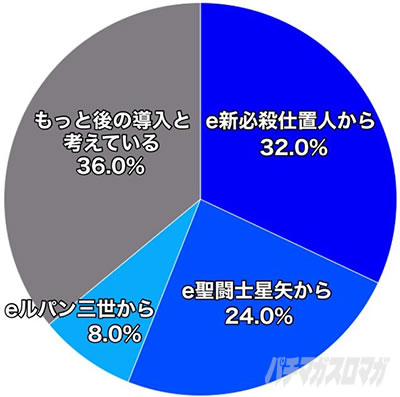 「e新必殺仕置人から導入する」と回答した店長が32.0%と最も多い結果に。e仕置人の実機を見た店長達の評価がかなり高いようですが、e聖闘士星矢とeルパン三世はP機のスペック違いなので、期待感としてはやや下がってしまうんでしょうか? では、それぞれの回答を見ていきましょう。