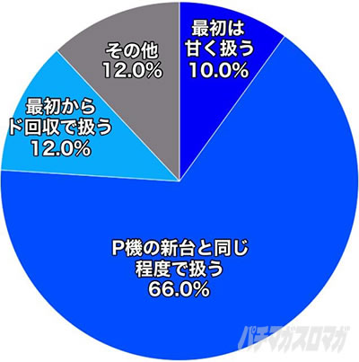 お次はスマパチの運用方法について。規則改正の境目はユーザーにとっても狙い目となりがちでしたが、残念ながら「最初は甘く扱う」と回答した店長は10.0%という結果に……。「P機の新台と同じ程度で扱う」という回答も『適度に回収する(黒字営業)』と強引に解釈した場合、約8割のホールが回収から入る可能性が……。では、それぞれの回答を見ていきましょう。